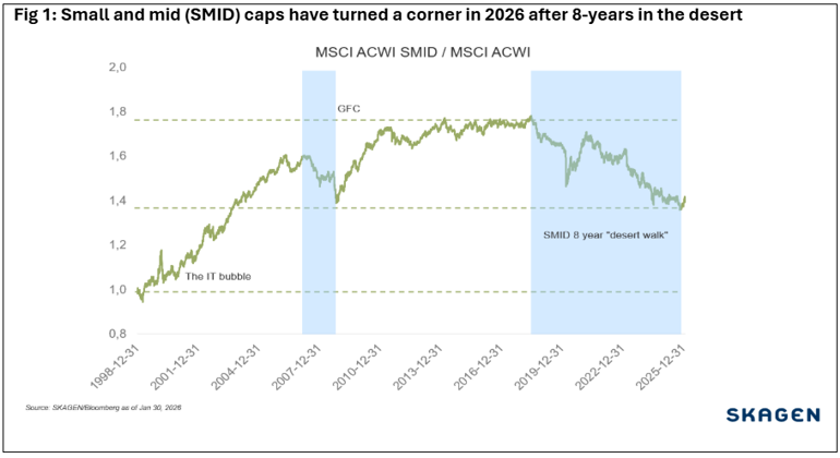 Bland vinnarna i denna närmast dramatiska rotation, finner vi rabatterade små och medelstora bolag, särskilt sådana med kopplingar till den traditionella ekonomin som ofta har ett större kapitalbehov. Det är betydligt mer osannolikt att se hur bolag inom exempelvis cementproduktion eller stålindustrin kan hotas av AI-drivna förändringar. Mindre och medelstora bolag i Europa med denna bakgrund har länge handlats på en substantiell rabatt till normaliserad intjäning i avvaktan på bättre konjunktur. Till den positiva bilden tillkommer en lägre inflation och räntor, ökade finanspolitiska satsningar på infrastruktur och försvar, åtgärder för att skydda inhemska sektorer som stål, bilar och industriella kemikalier. Utsikter till investeringar för återuppbyggnad efter ett potentiellt krigsupphörande i Ukraina bidrar även till att förbättra utsikterna på medellång sikt.