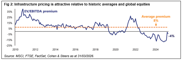 Current valuations are also attractive. Listed infrastructure trades at a rare discount of approximately 4% to global equities on an EV/EBITDA basis, compared with a long-run average premium of 8% – a dislocation that has historically preceded periods of strong relative performance.