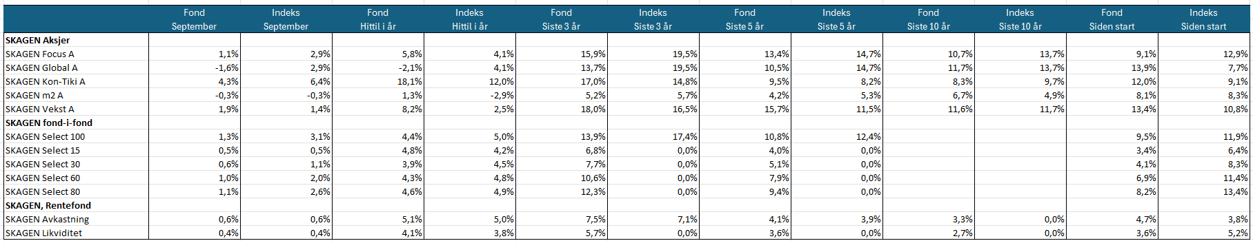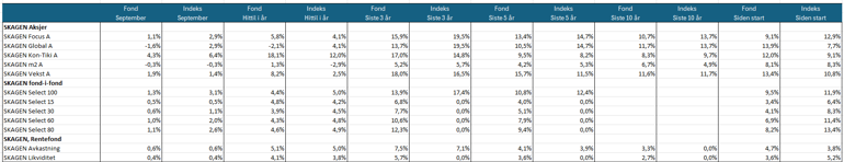 Klikk på tabellen for en større versjon. Perioder over 12 mnd viser gjennomsnittlig årlig avkastning.