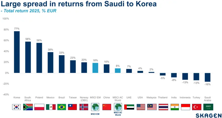 Aktier på tillväxtmarknader har utvecklats starkt under 2025, drivet av AI-momentum. SKAGEN ...